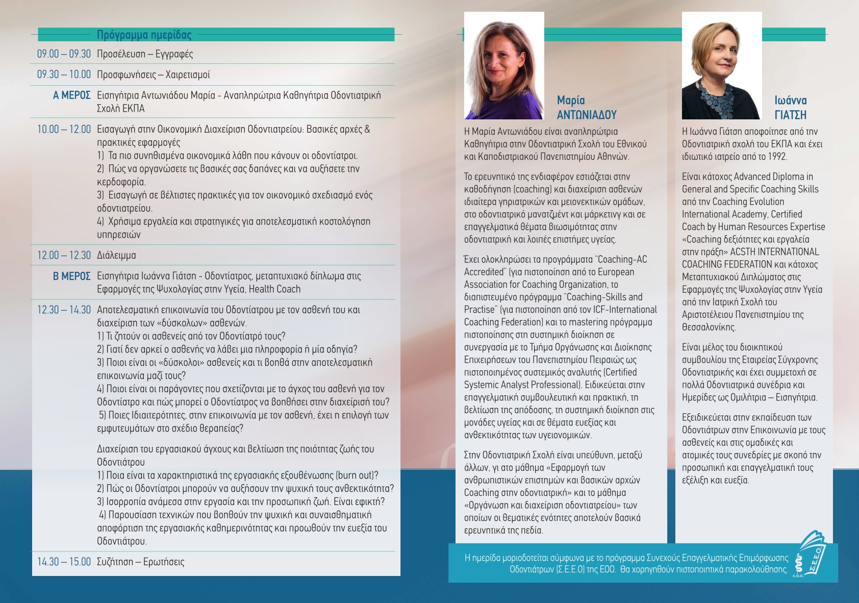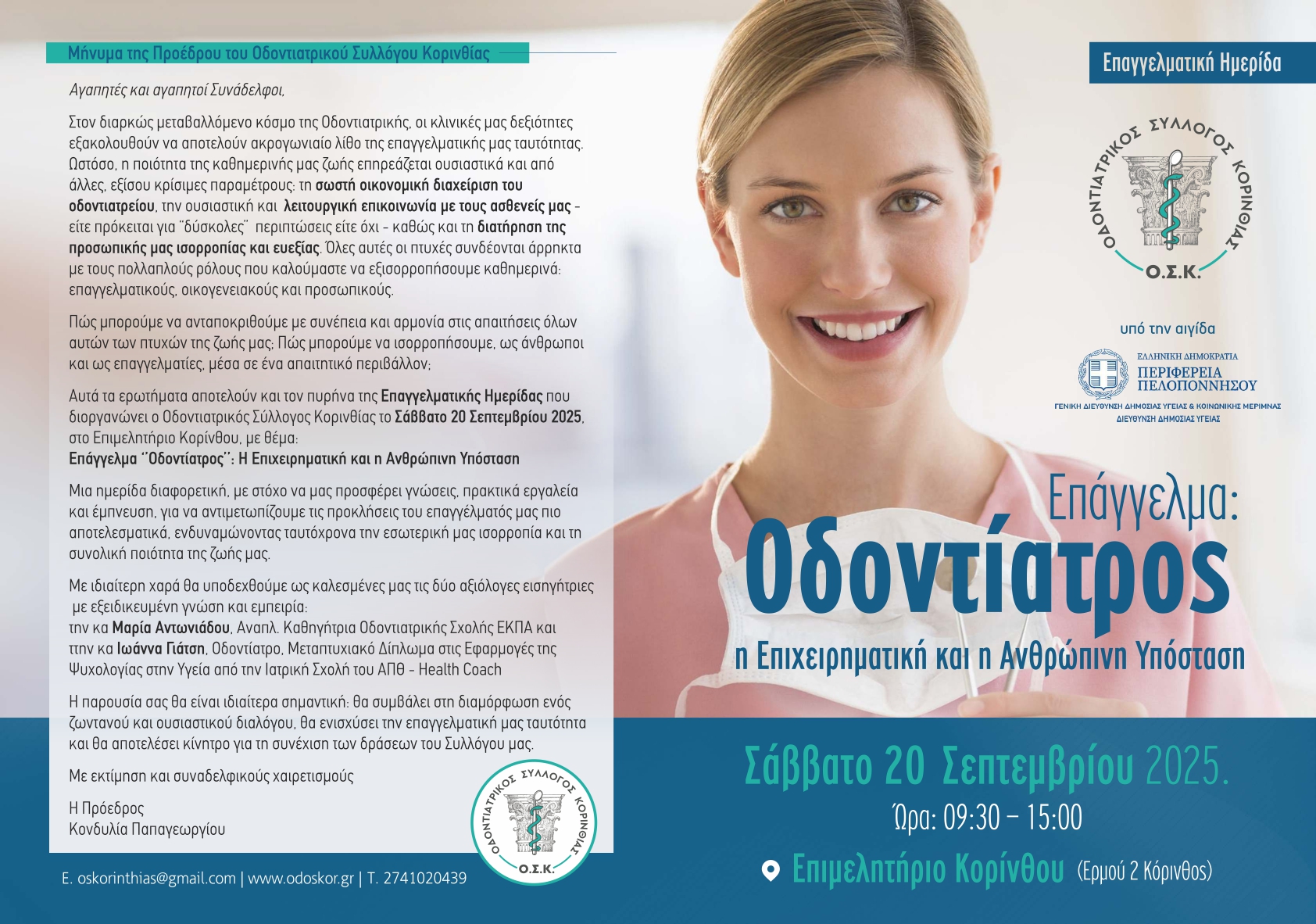 Μια ημερίδα διαφορετική που συνδυάζει επιστημονική γνώση, πρακτικά εργαλεία και προσωπική ενδυνάμωση, αφιερωμένη στον Οδοντίατρο- τον Άνθρωπο πίσω από τη μάσκα.